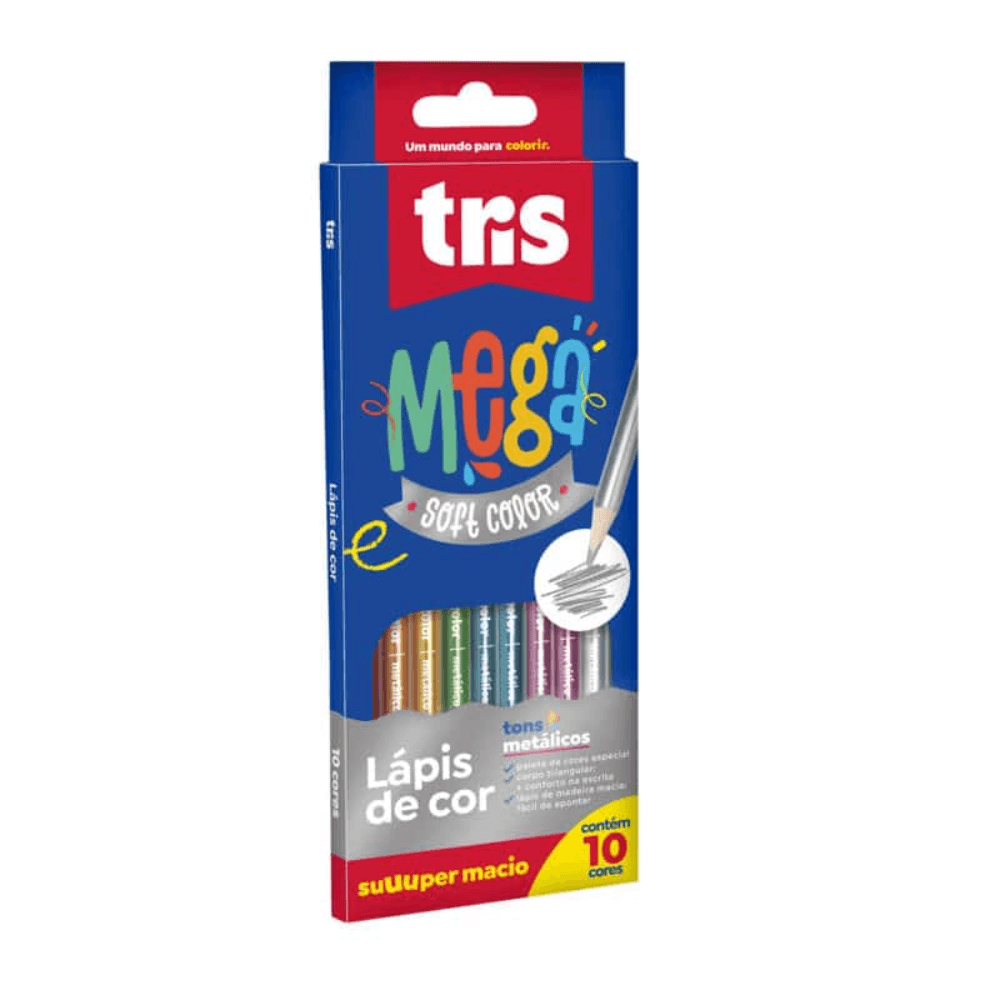 MEGA divertido! MEGA colorido! A linha de colorir MEGA da TRIS é uma alternativa de qualidade para potencializar a criatividade dos seus usuários. Paleta especial com 10 lindos tons metálicos! Lápis de madeira, de traço super macio e corpo triangular. Os lápis possuem o nome das cores e mina 2.9mm.