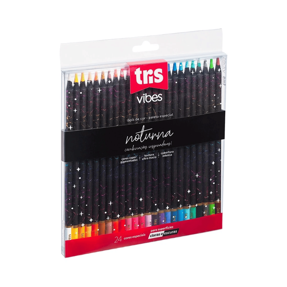 A paleta Noturna reinventa as 24 cores e expande as possibilidades de criação ao oferecer excelente pigmentação no papel claro ou escuro. Possui mina de 4.0mm, o corpo redondo e estampas holográficas.