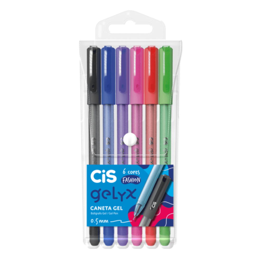 Ponta 0.5mm Escrita macia Clip plástico na tampa Corpo na cor da tinta Cores: Azul, Preta, Vermelha, Verde, Rosa e Roxa